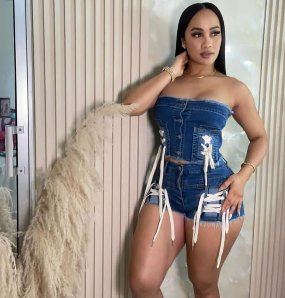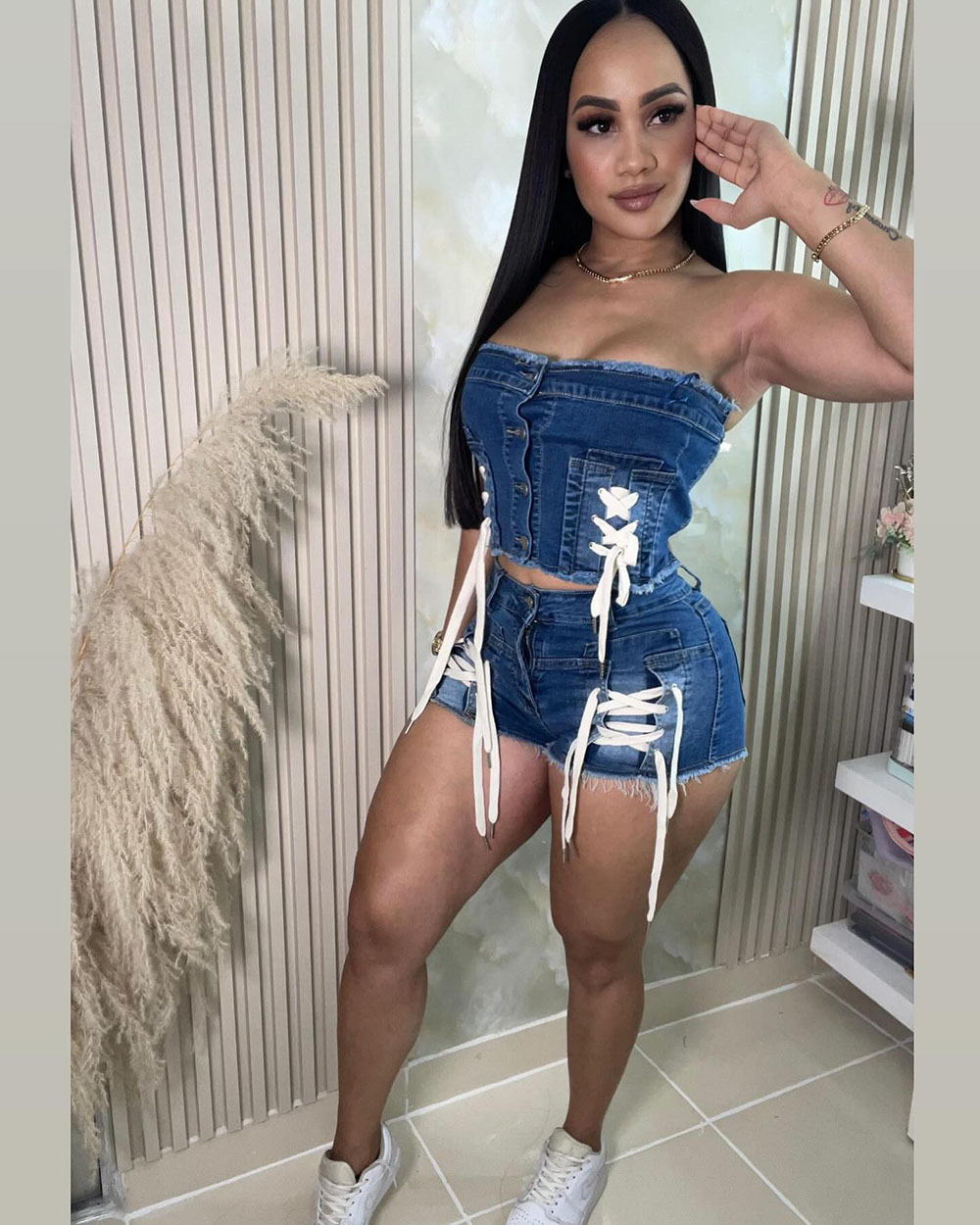Stylish Design: European and American style with trendy chest wrap strap top and high-waist shorts.